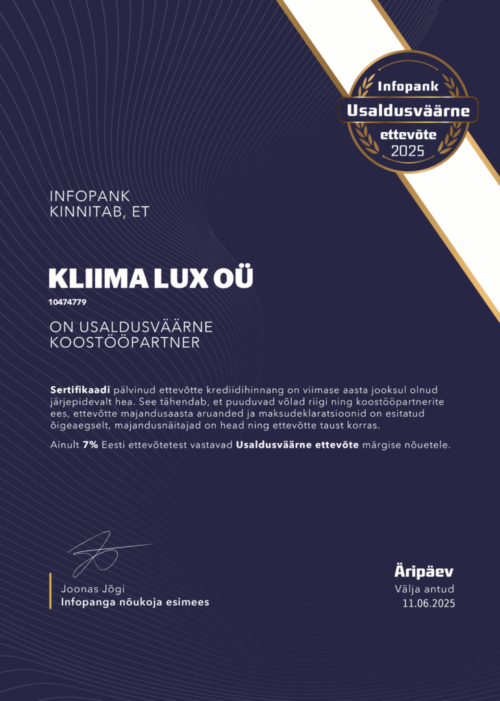 Kliima Lux on kogenud õhksoojuspumpade spetsialist, kes pakub täisteenust alates nõustamisest kuni hoolduseni. Meie seljataga on kümneid edukalt lõpetatud projekte, mis on toonud rahulolu nii kodudesse kui ka äriruumidesse üle Eesti.